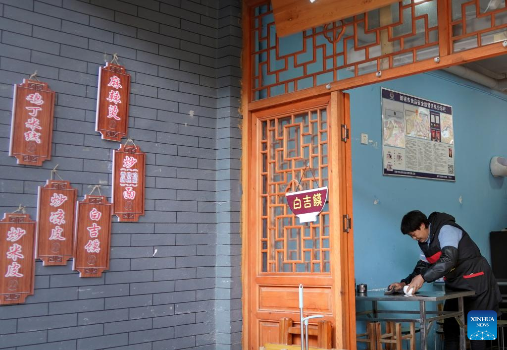 A villager cleans up at her restaurant at Fuxi Mountain tourism area in Xinmi City, central China's Henan Province, Dec. 22, 2021. In recent years, Fuxi Mountain area in Xinmi, has taken advantages of natural resources and local culture to promote tourism. By participating in the construction of scenic spots and providing jobs in these spots, it has helped more than 20,000 local people increase their income and promote regional economy development. (Xinhua/Li An)