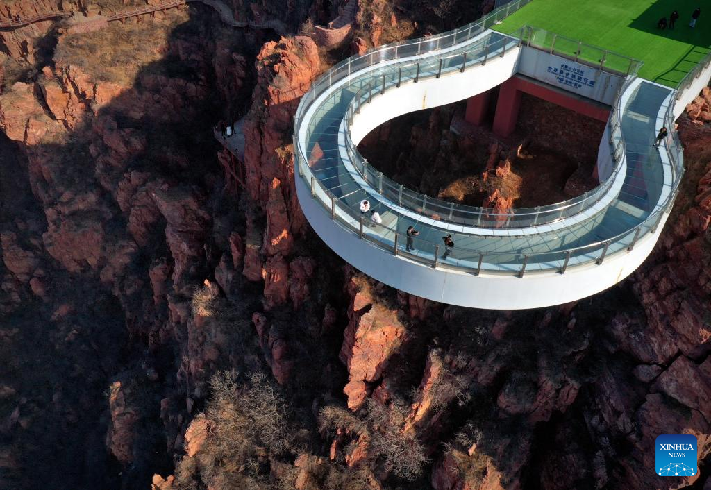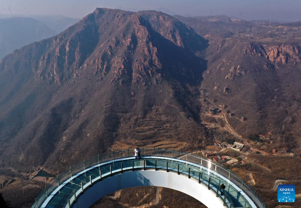 Aerial photo taken on Dec. 22, 2021 shows tourists visiting a glass-bottomed corridor at Fuxi Mountain tourism area in Xinmi City, central China's Henan Province. In recent years, Fuxi Mountain area in Xinmi, has taken advantages of natural resources and local culture to promote tourism. By participating in the construction of scenic spots and providing jobs in these spots, it has helped more than 20,000 local people increase their income and promote regional economy development. (Xinhua/Li An)
