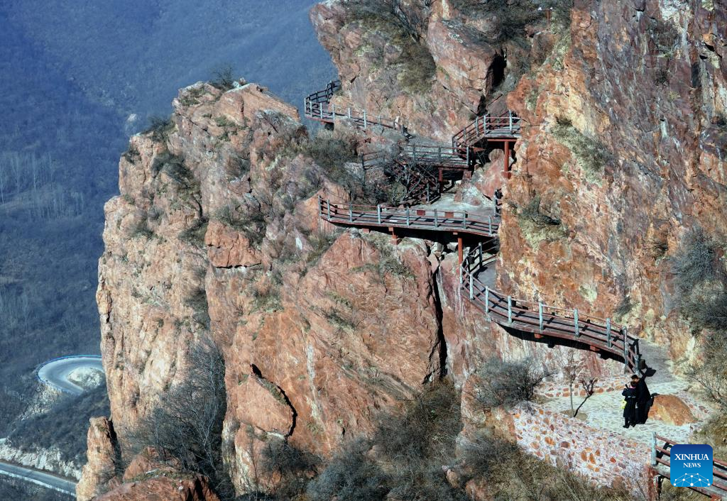 Tourists visit Fuxi Mountain tourism area in Xinmi City, central China's Henan Province, Dec. 22, 2021. In recent years, Fuxi Mountain area in Xinmi, has taken advantages of natural resources and local culture to promote tourism. By participating in the construction of scenic spots and providing jobs in these spots, it has helped more than 20,000 local people increase their income and promote regional economy development. (Xinhua/Li Jianan)