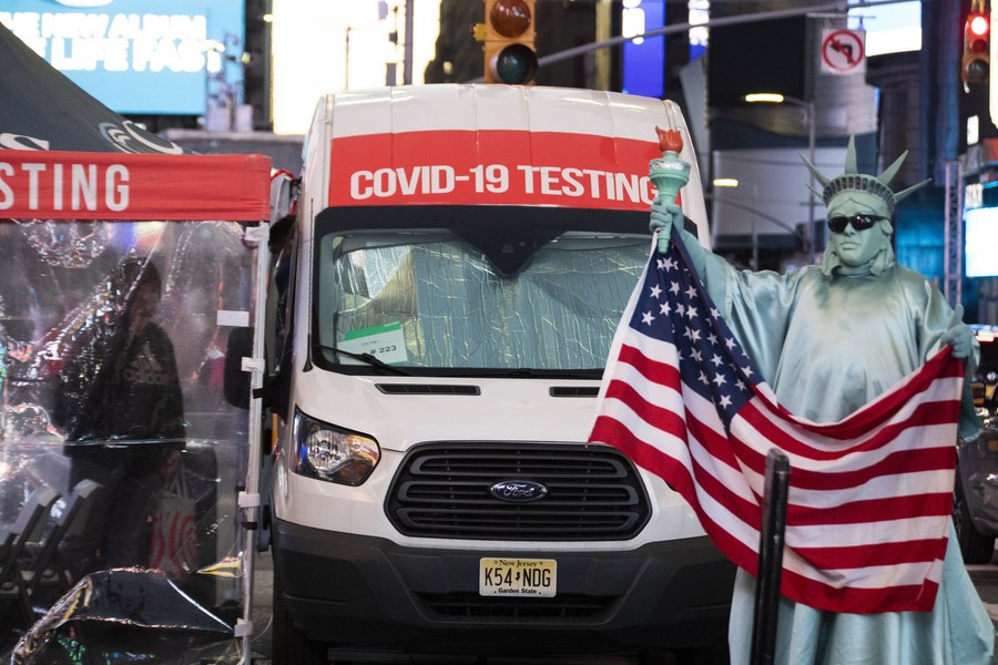 A street performer waits for customers next to a mobile COVID-19 testing site on Times Square in New York, the United States, Dec. (Xinhua/Wang Ying)