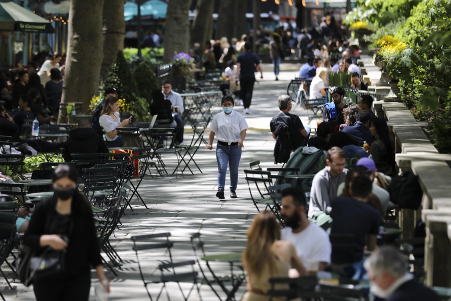 A woman walks through Bryant Park in New York, the United States, May 14, 2021. (Xinhua/Wang Ying)