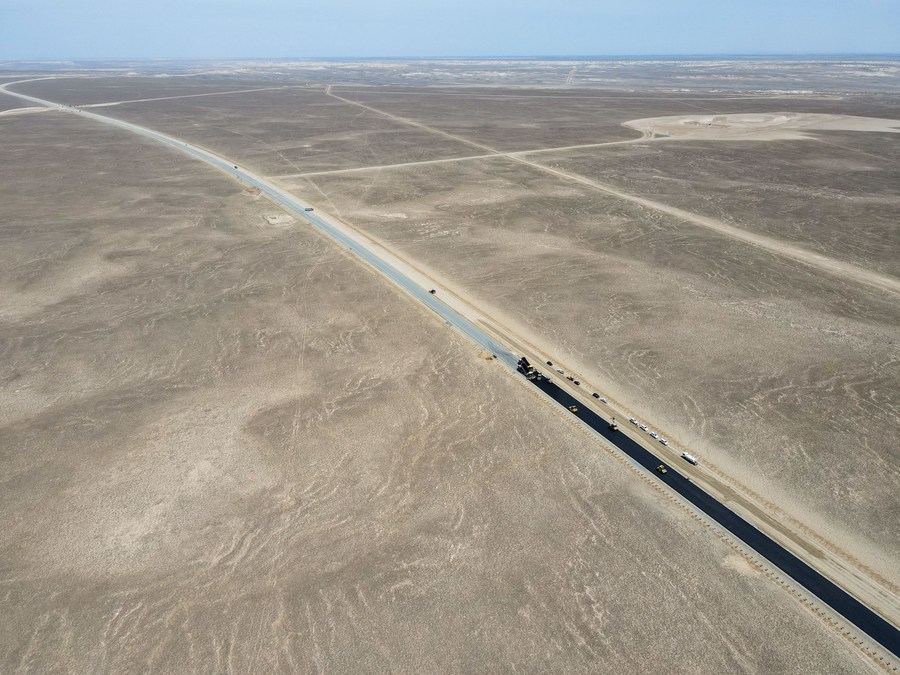 In this aerial photo, vehicles pave a section of a cross-desert expressway with asphalt in northwest China's Xinjiang Uygur Autonomous Region, July 16, 2021. (Xinhua/Gao Han)