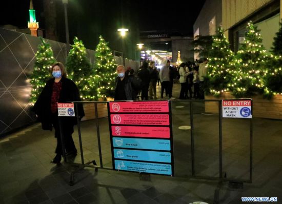 Signs of COVID-19 countermeasures are seen at the entrance of a Christmas market in downtown Beirut, Lebanon, on Dec. 25, 2021. Lebanon's Health Ministry announced on Saturday that the number of cases of COVID-19 Omicron variant stands at 433 so far. (Xinhua/Liu Zongya)