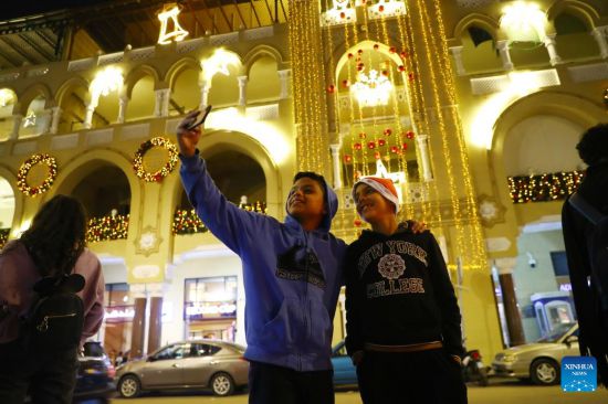 People take selfie with Christmas decorations on a building in Cairo, Egypt, on Dec. 25, 2021. (Xinhua/Ahmed Gomaa)