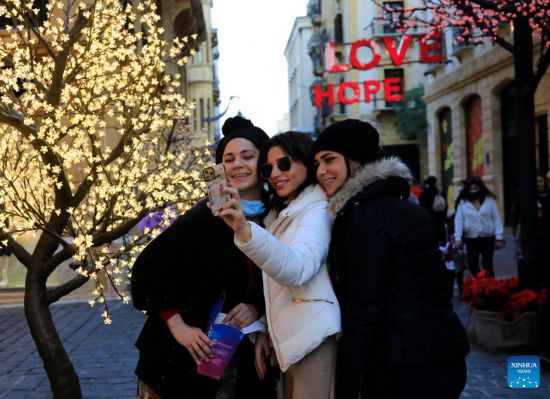 People take a selfie at a Christmas market in downtown Beirut, Lebanon, on Dec. 25, 2021. (Xinhua/Liu Zongya)