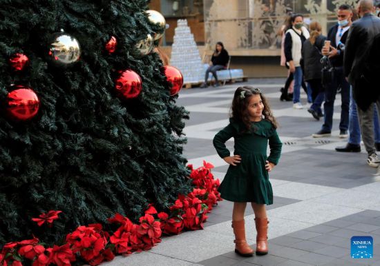 A girl poses for a photo in front of a Christmas tree in downtown Beirut, Lebanon, on Dec. 25, 2021. (Xinhua/Liu Zongya)