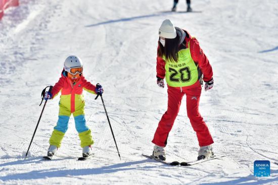 An instructor teaches a kid to ski at a ski resort in Shijiazhuang, north China's Hebei Province, Dec. 25, 2021. (Photo by Zhang Xiaofeng/Xinhua)