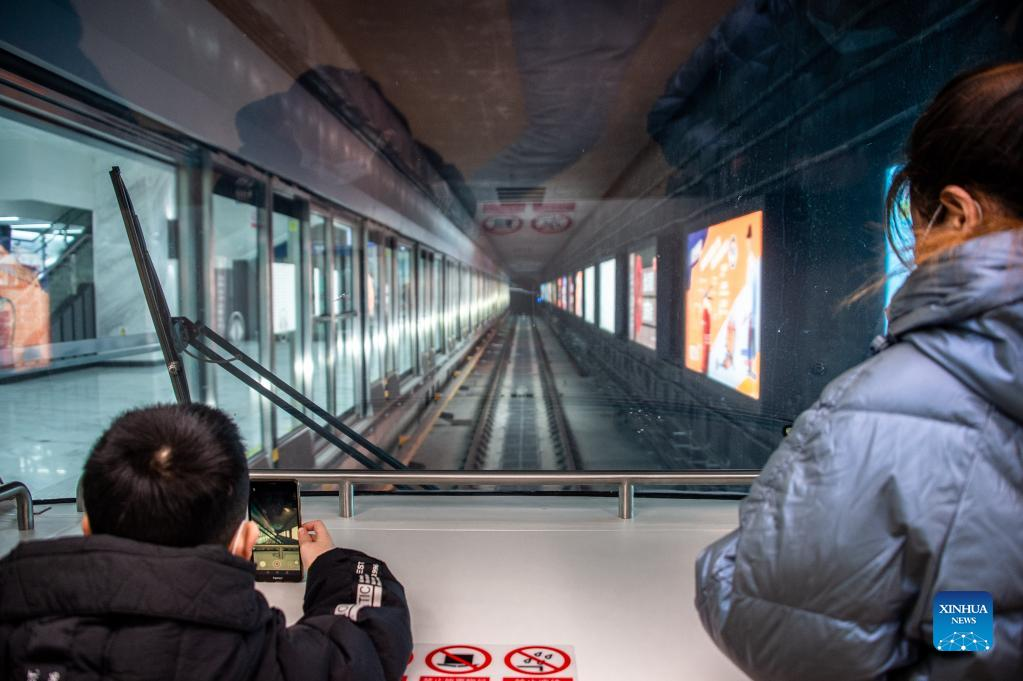 Passengers take photos on the first carriage of a train of the Metro Line 5 in Wuhan, central China's Hubei Province, Dec. 26, 2021. Three urban rail lines in Wuhan opened to the public on Sunday - Line 5, the second phase of Line 6, and Line 16 (Hannan), boasting a total length of 75.2 km. Line 5 is Wuhan's first fully automated metro line. Line 16 is built along the Yangtze River, with the highest station standing at 30 meters, offering passengers a nice view. The total length of metro rails in operation in Wuhan has reached 435 km. (Photo by Wu Zhizun/Xinhua)