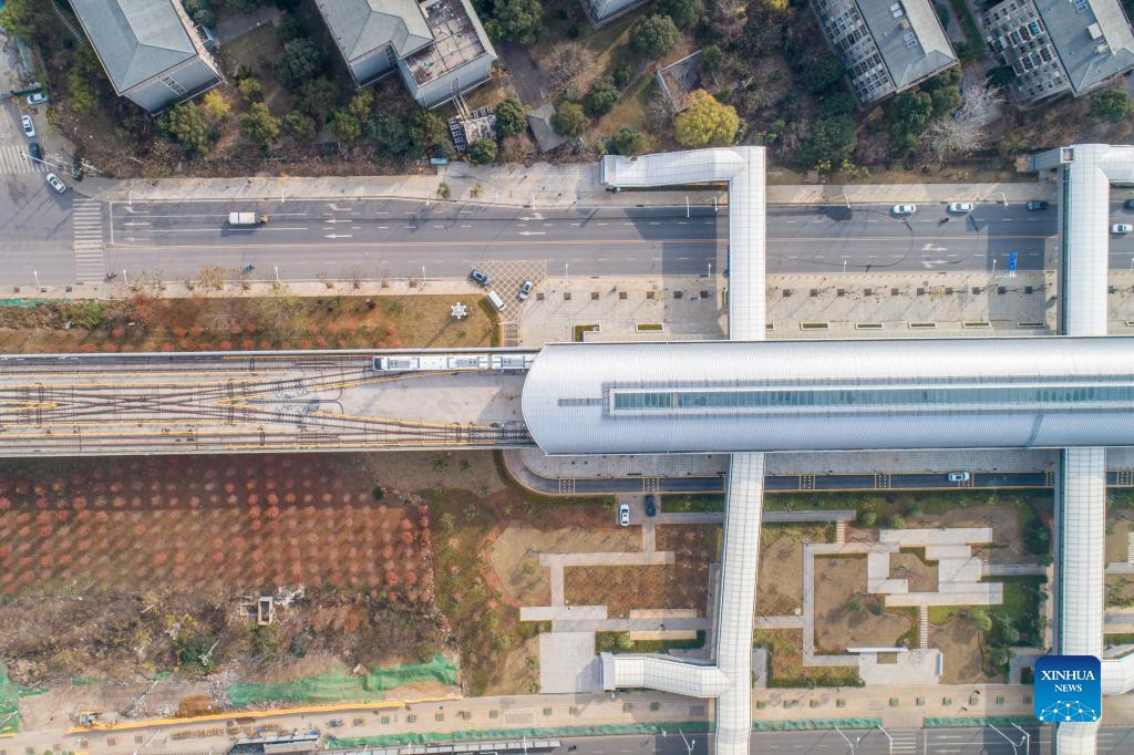 Aerial photo taken on Dec. 26, 2021 shows a train pulling out of the Hubei University of Chinese Medicine Station of the Metro Line 5 in Wuhan, central China's Hubei Province. Three urban rail lines in Wuhan opened to the public on Sunday - Line 5, the second phase of Line 6, and Line 16 (Hannan), boasting a total length of 75.2 km. Line 5 is Wuhan's first fully automated metro line. Line 16 is built along the Yangtze River, with the highest station standing at 30 meters, offering passengers a nice view. The total length of metro rails in operation in Wuhan has reached 435 km. (Photo by Wu Zhizun/Xinhua)