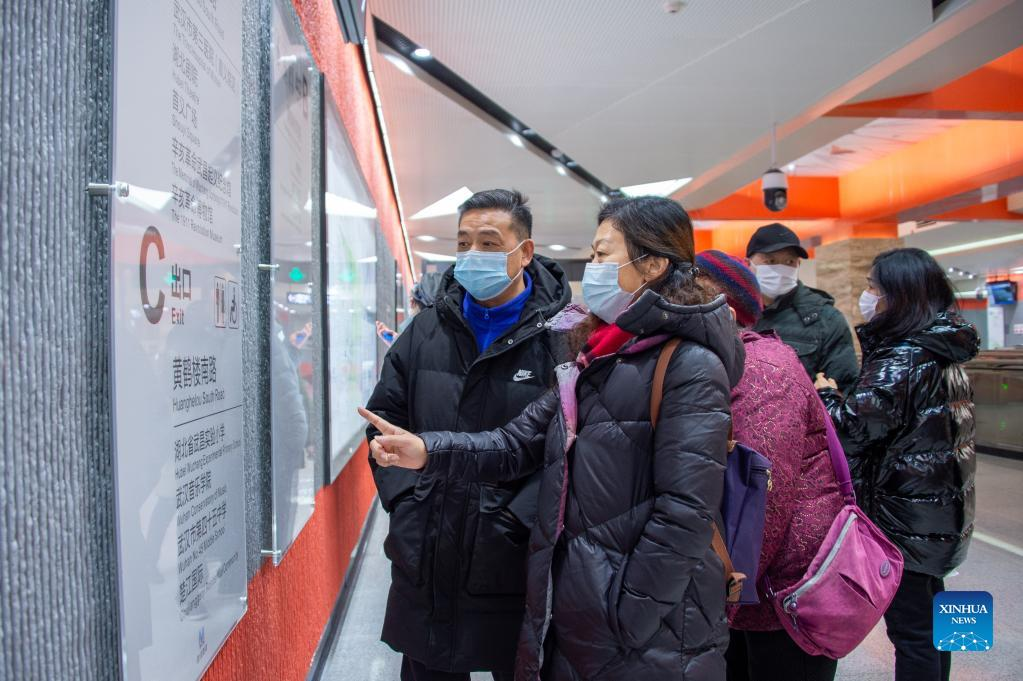 Passengers look on route information at the Pengliuyang Station of the Metro Line 5 in Wuhan, central China's Hubei Province, Dec. 26, 2021. Three urban rail lines in Wuhan opened to the public on Sunday - Line 5, the second phase of Line 6, and Line 16 (Hannan), boasting a total length of 75.2 km. Line 5 is Wuhan's first fully automated metro line. Line 16 is built along the Yangtze River, with the highest station standing at 30 meters, offering passengers a nice view. The total length of metro rails in operation in Wuhan has reached 435 km. (Photo by Wu Zhizun/Xinhua)