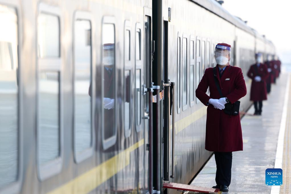 Stewardesses welcome passengers to board the first train of the Jiuqian-Dongfeng section of Jiuquan-Ejina railway at Suzhou Railway Station in Jiuquan City, northwest China's Gansu Province, Dec. 26, 2021. The Jiuqian-Dongfeng section of the railway linking Jiuquan of northwest China's Gansu Province and Ejina Banner of north China's Inner Mongolia Autonomous Region started operation after upgrading on Sunday. The section, with a length of 243.731 km, traverses Badanjilin Desert. (Xinhua/Chen Bin)