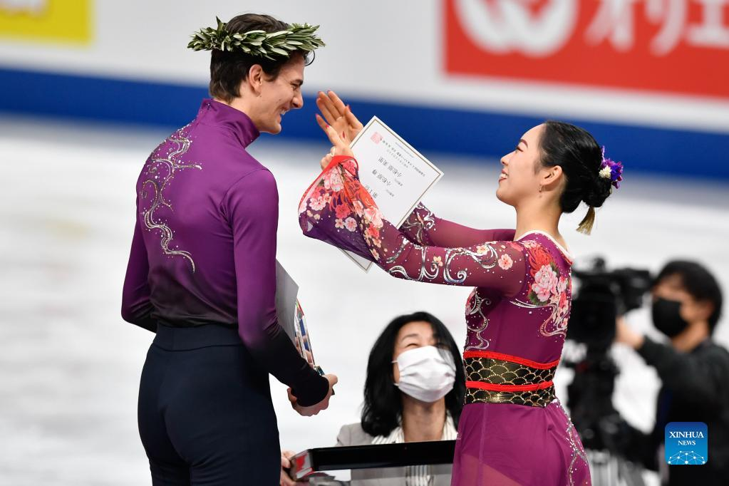 Komatsubara Misato (front R) and Komatsubara Takeru of Japan celebrate on the podium during the awarding ceremony after the ice dance competition at the All-Japan Figure Skating Championships held in Saitama, Japan, Dec. 25, 2021. (Xinhua/Zhang Xiaoyu)