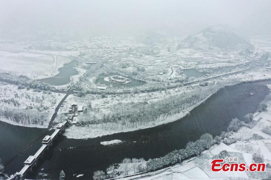 Snow-capped Shadong village looks picturesque at the foot of Fanjing Mountain in the southwest China’s Guizhou Province, Dec. 26, 2021. (China News Service/Li he)