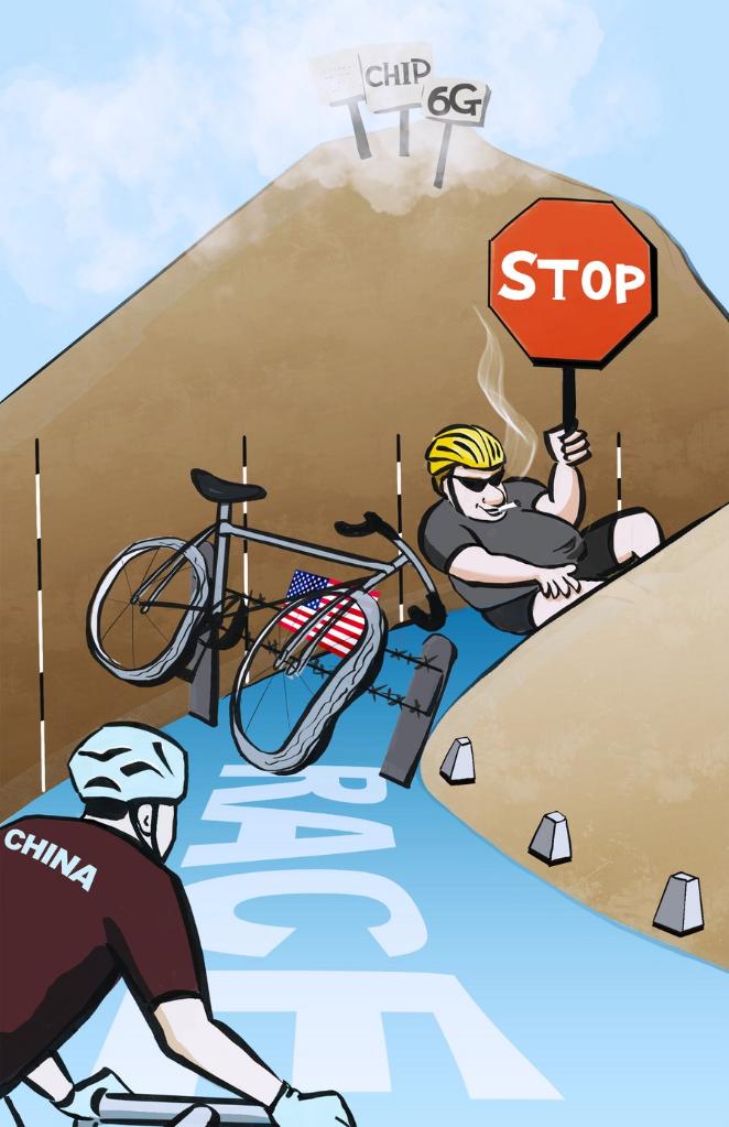 The U.S. efforts to contain China's tech is akin to two cyclists racing uphill. The leader stops and casts his bike aside, choosing instead to set up roadblocks to slow down his closing competitor. (Xinhua/Pan Hongyu)