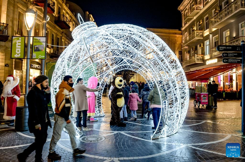 New Year lights and decorations are seen in the downtown area of Baku, Azerbaijan, on Dec. 25, 2021. (Photo by Tofik Babayev/Xinhua)