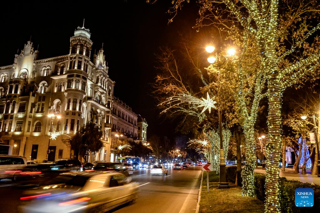 New Year lights and decorations are seen in the downtown area of Baku, Azerbaijan, on Dec. 25, 2021. (Photo by Tofik Babayev/Xinhua)