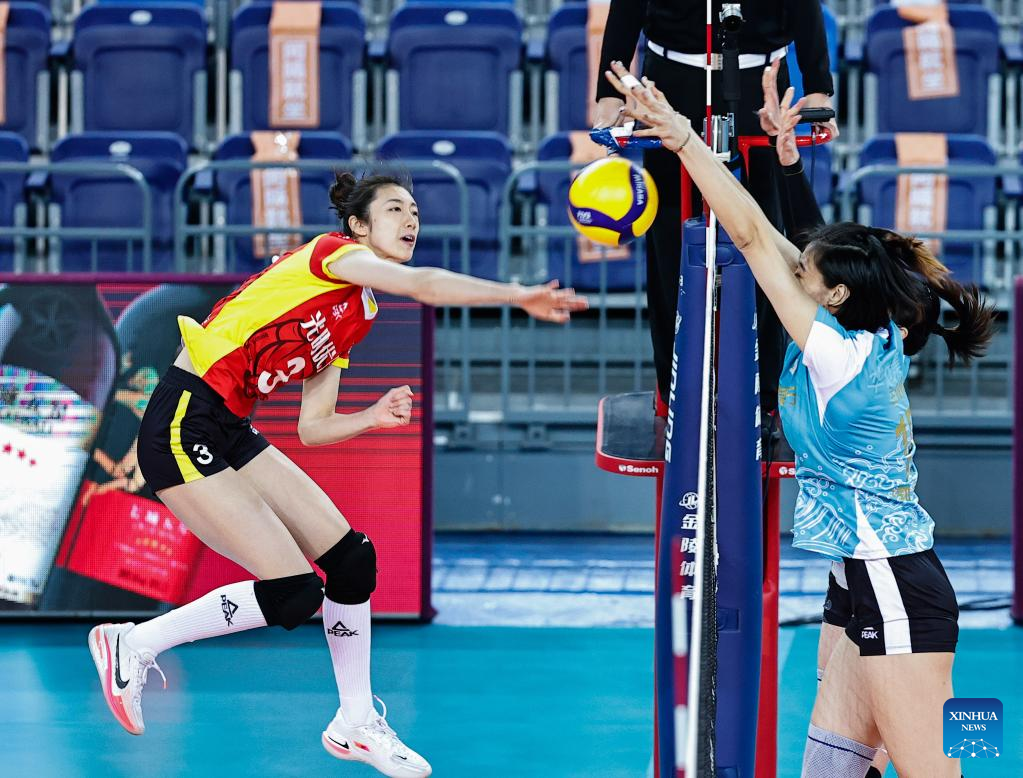 Liu Zhening (L) of Shanghai spikes the ball during the Group E match between Tianjin and Shanghai at the second stage of the 2021-2022 season Chinese Women's Volleyball Super League in Jiangmen, south China's Guangdong Province, Dec. 27, 2021. (Xinhua/Yang Zhisen)