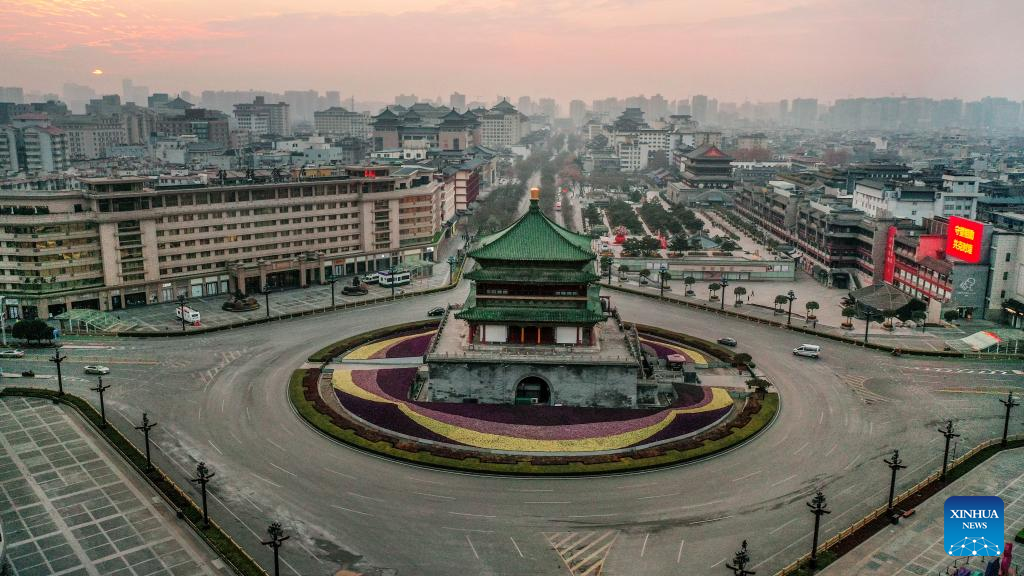 Aerial photo taken on Dec. 27, 2021 shows an empty square in Xi'an, northwest China's Shaanxi Province. (Xinhua/Tao Ming)