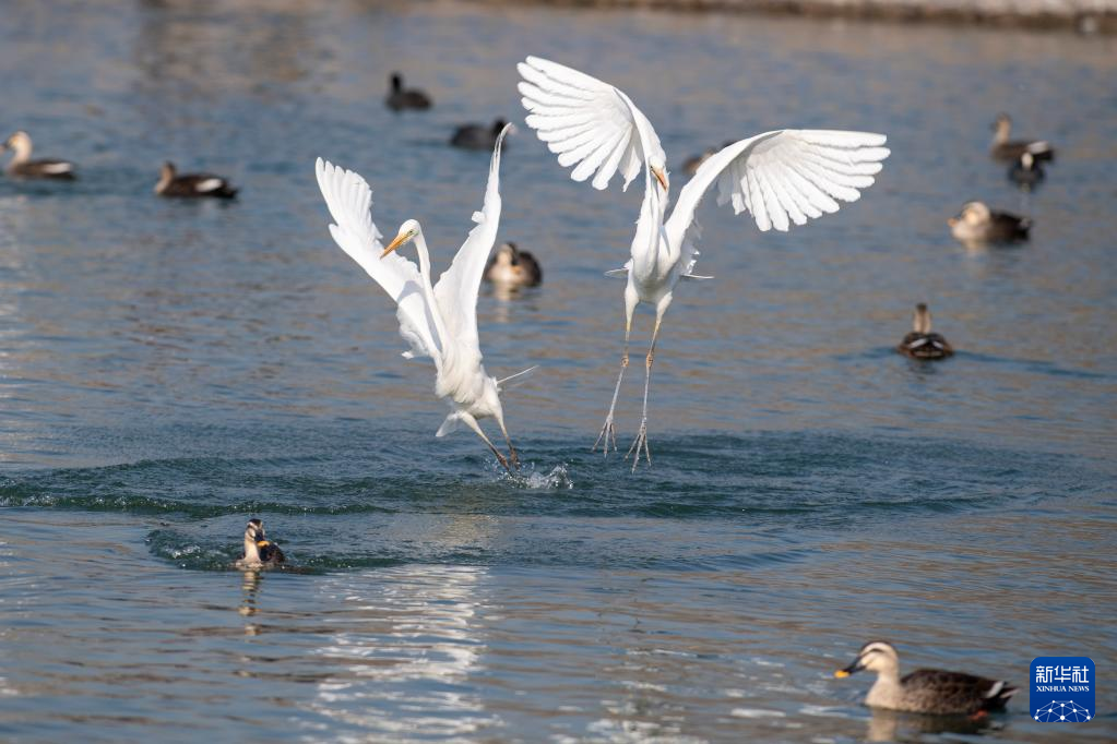 Egrets are seen at Fenhe river wetland park in Taiyuan, north China's Shanxi Province, Dec. 28, 2021. (Xinhua/Yang Chenguang)