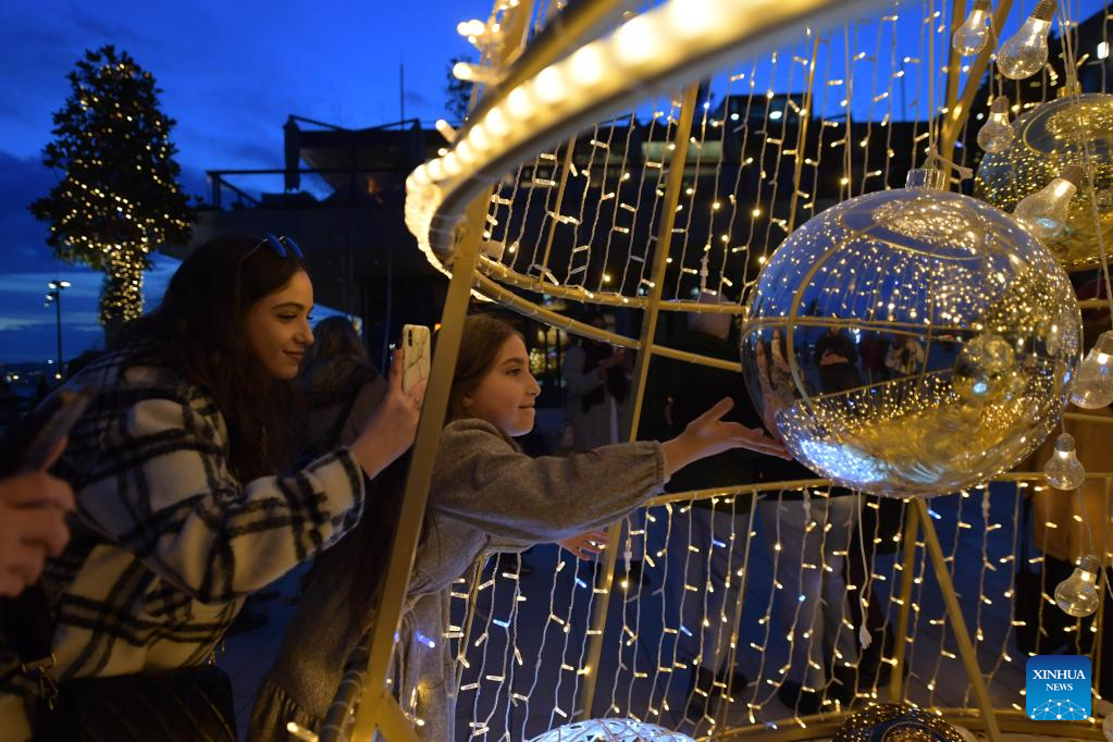 People take photos of a light installation to greet seasonal holidays in Istanbul, Turkey, Dec. 27, 2021. (Xinhua/Shadati)