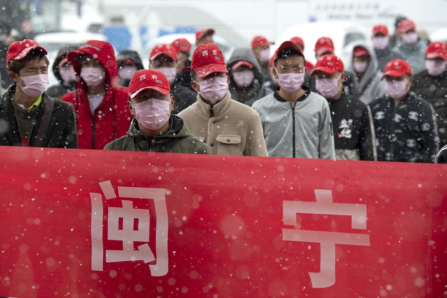 Migrant workers wait to board a chartered airplane of Xiamen Airlines at Guyuan Liupanshan Airport in Guyuan City, northwest China's Ningxia Hui Autonomous Region, Feb. 27, 2020. (Xinhua/Feng Kaihua)