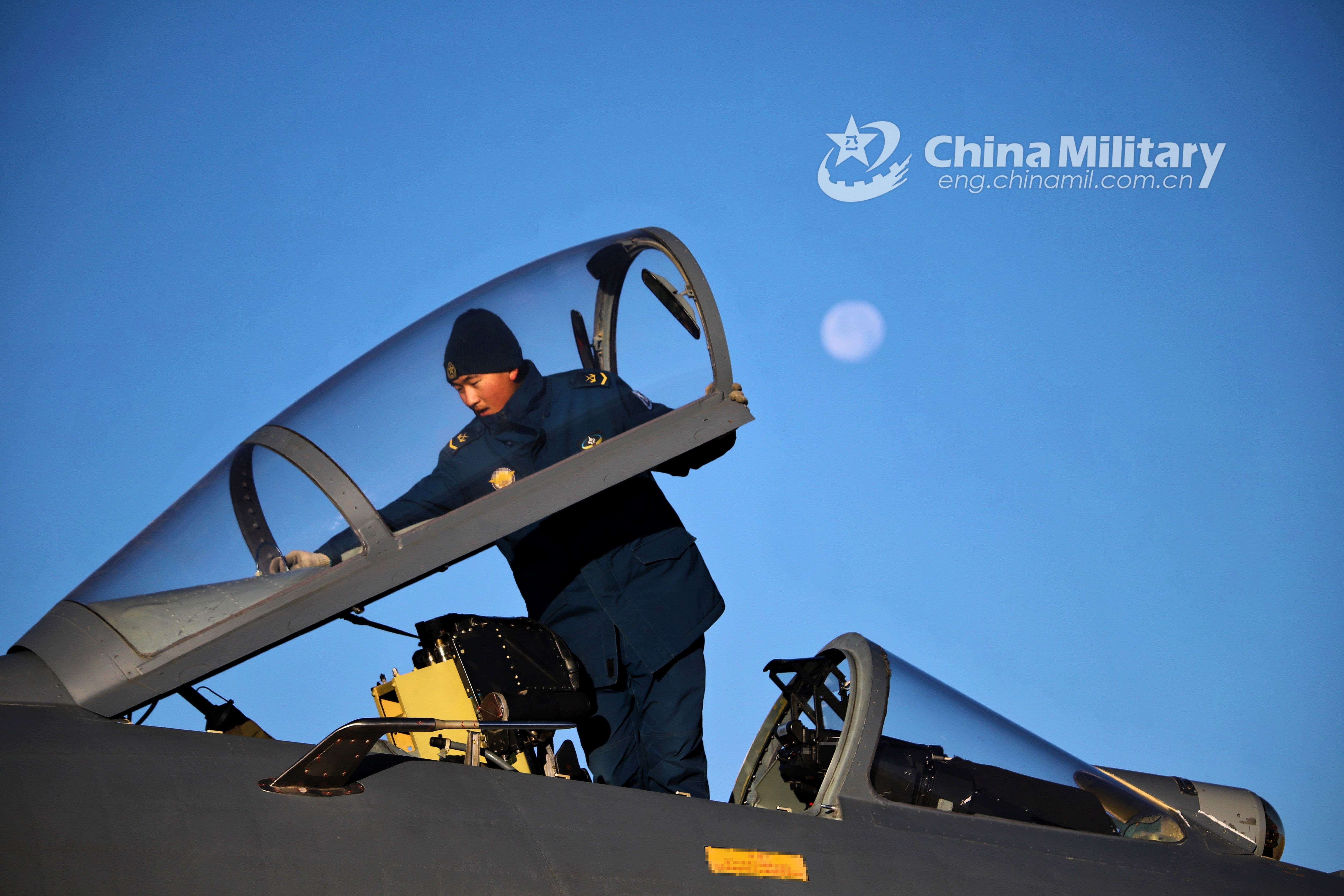 A ground crew member assigned to an aviation brigade of the air force under the PLA Western Theater Command inspects the canopy of a fighter jet prior to a flight training mission from December 21 to 22, 2021. (eng.chinamil.com.cn/Photo by Wen Rui)