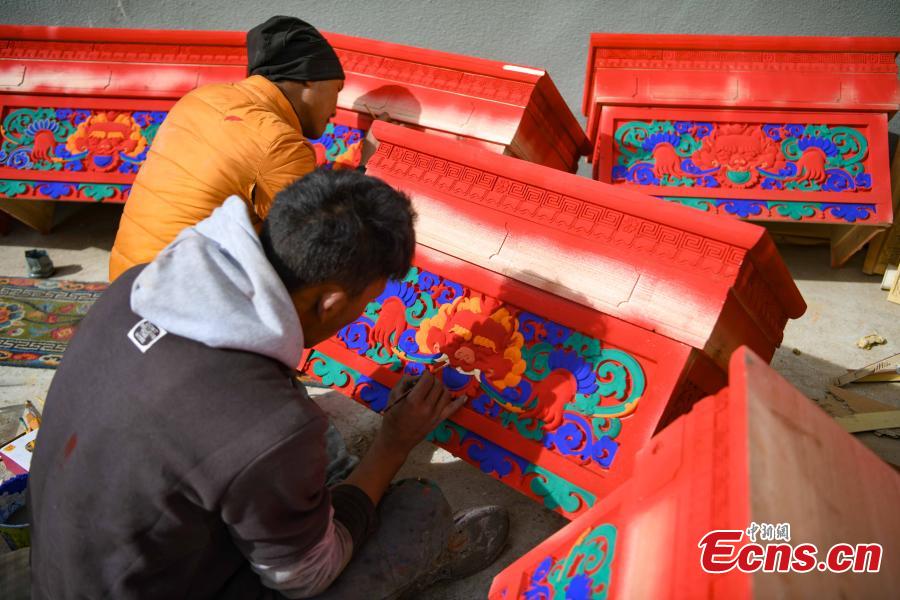 Folk craftspeople from a handcraft cooperative draw Tibetan trims on furniture in Lhasa, southwest China's Tibet Autonomous Region, Dec. 28, 2021. (Photo/China News Service)