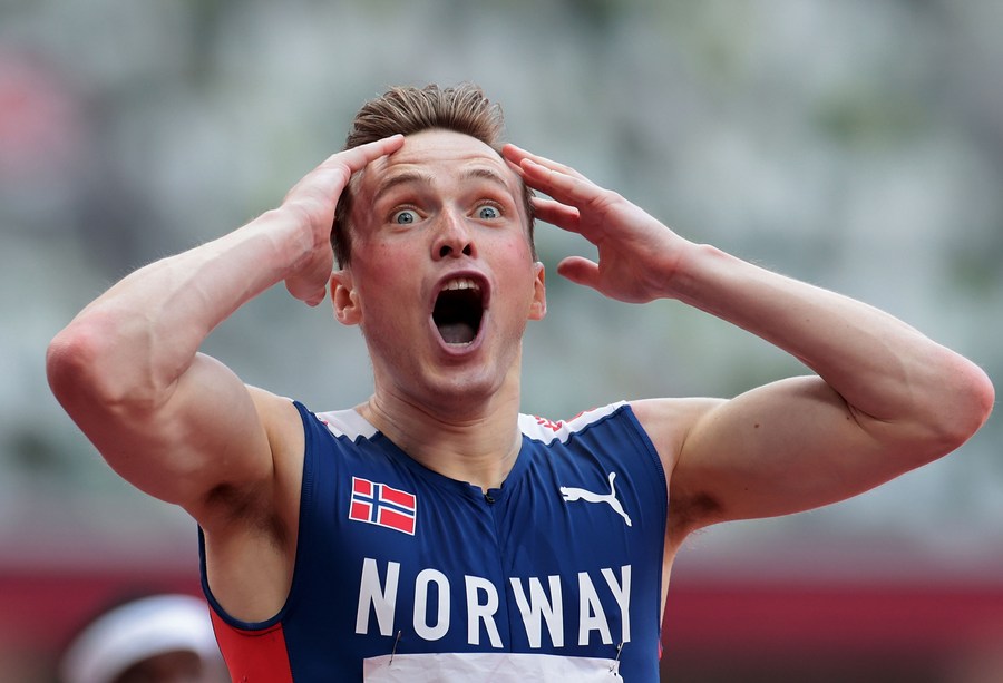 Karsten Warholm of Norway celebrates after the men's 400m hurdles final at the Tokyo 2020 Olympic Games in Tokyo, Japan, Aug. 3, 2021. (Xinhua/Li Gang)