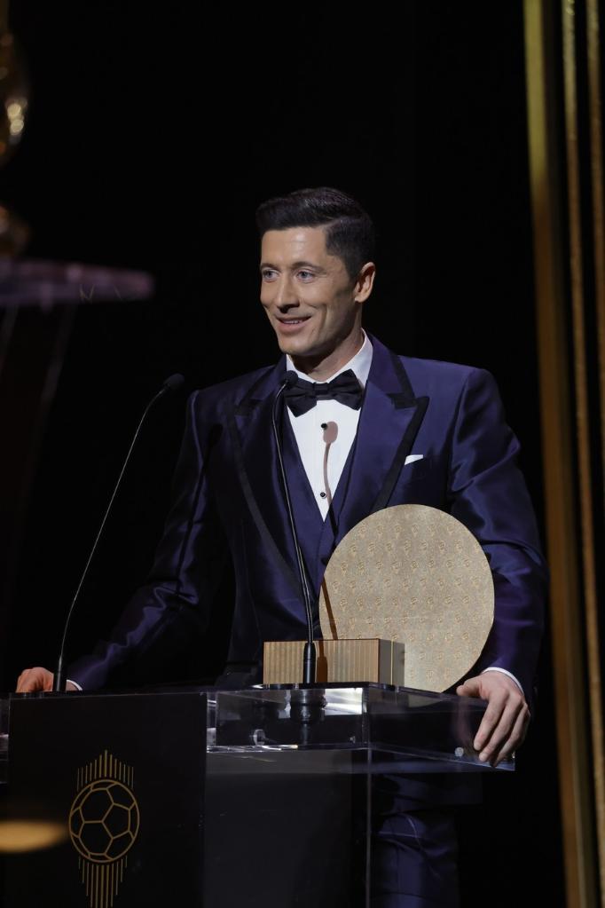 Robert Lewandowski speaks after receiving the Striker of the Year award at the ceremony for Ballon d'Or 2021, Nov. 29, 2021. (Photo by Henri Szwarc/Xinhua)