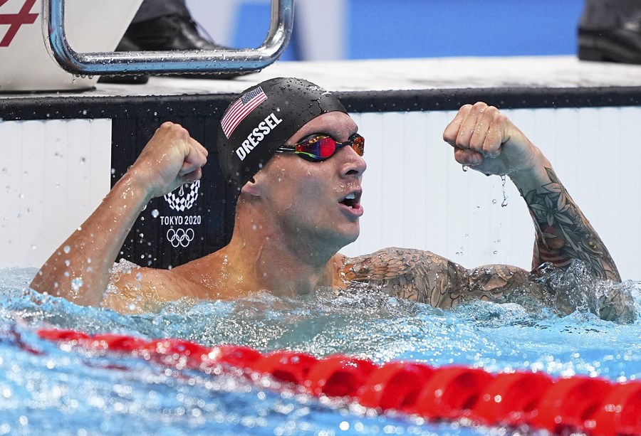 Caeleb Dressel of the United States celebrates after the men's 50m freestyle final of swimming at the Tokyo 2020 Olympic Games in Tokyo, Japan, Aug. 1, 2021. (Xinhua/Xu Chang)