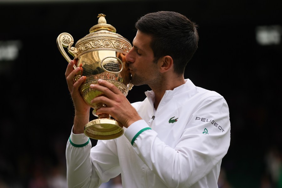 Novak Djokovic of Serbia celebrates with the trophy after winning the Wimbledon men's final in London, Britain, on July 11, 2021. (Photo by Tim Ireland/Xinhua)