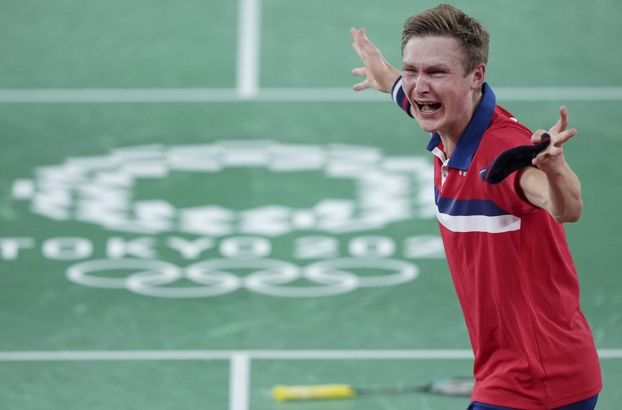Viktor Axelsen of Denmark celebrates after the men's singles badminton final against Chen Long of China at the Tokyo 2020 Olympic Games in Tokyo, Japan, Aug. 2, 2021. (Xinhua/Xue Yubin)