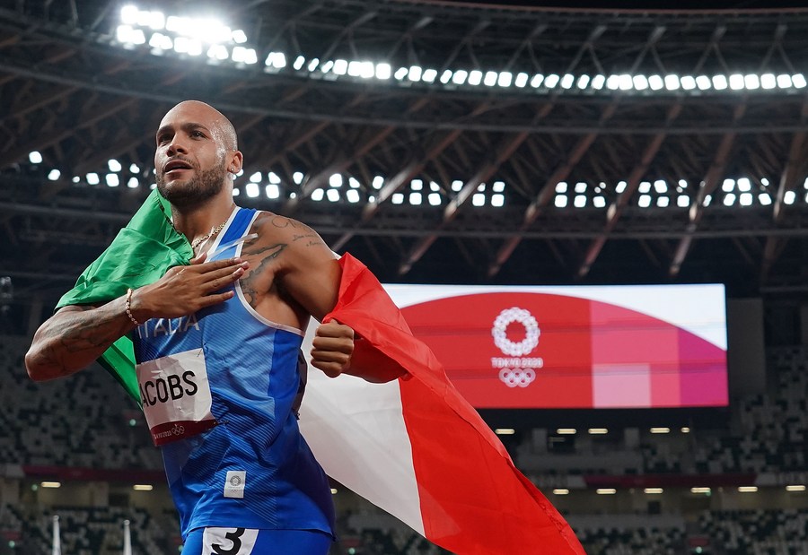 Lamont Marcell Jacobs of Italy reacts after the men's 100m final at the Tokyo 2020 Olympic Games in Tokyo, Japan, Aug. 1, 2021. (Xinhua/Li Gang)