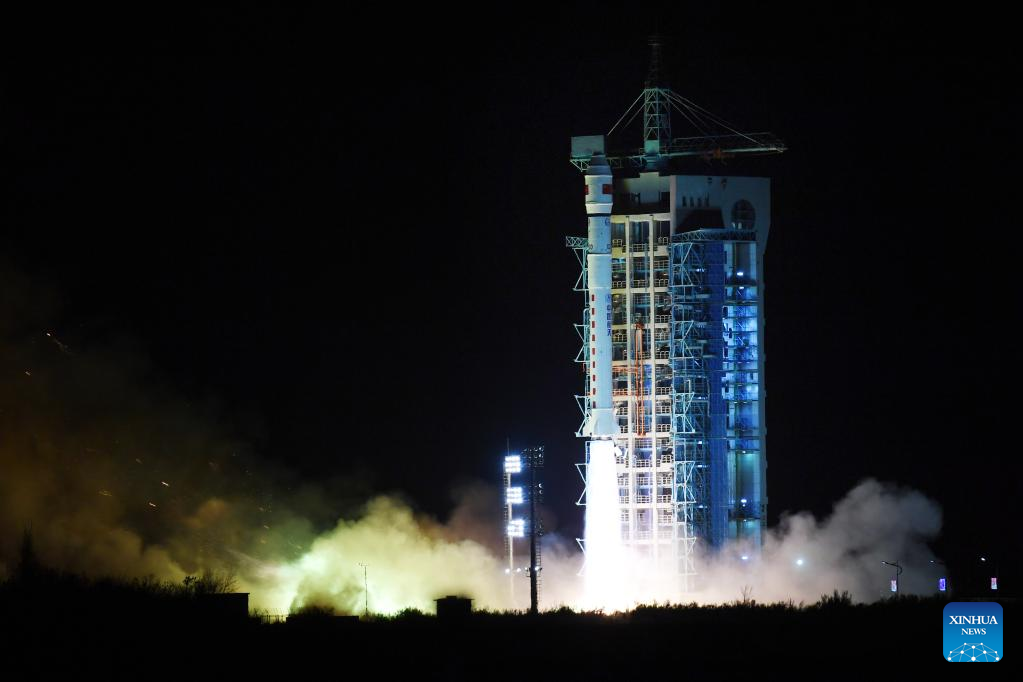 A Long March-2D carrier rocket carrying the Tianhui-4 satellite blasts off from the Jiuquan Satellite Launch Center in northwest China, Dec. 29, 2021. China on Wednesday successfully sent the Tianhui-4 satellite into space from the Jiuquan Satellite Launch Center. The satellite was launched at 7:13 p.m. (Beijing Time) and has entered its planned orbit. (Photo by Wang Jiangbo/Xinhua)