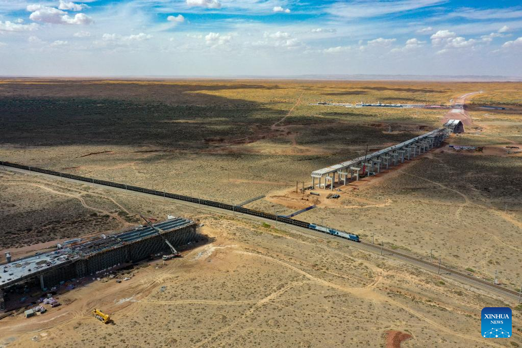 Aerial photo taken on July 10, 2020 shows the Qingtongxia-Zhongwei section of the Wuhai-Maqin expressway under construction in northwest China's Ningxia Hui Autonomous Region.
