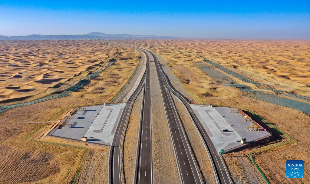 The Qingtongxia-Zhongwei section in Ningxia of the Wuhai-Maqin expressway, linking Wuhai in Inner Mongolia Autonomous Region and Maqin County in Qinghai Province, fully opened to traffic Wednesday. The 122.99-kilometer-long section, of which an 18 kilometers section goes through the hinterland of Tengger Desert, is the first desert expressway built in Ningxia. (Xinhua/Feng Kaihua)