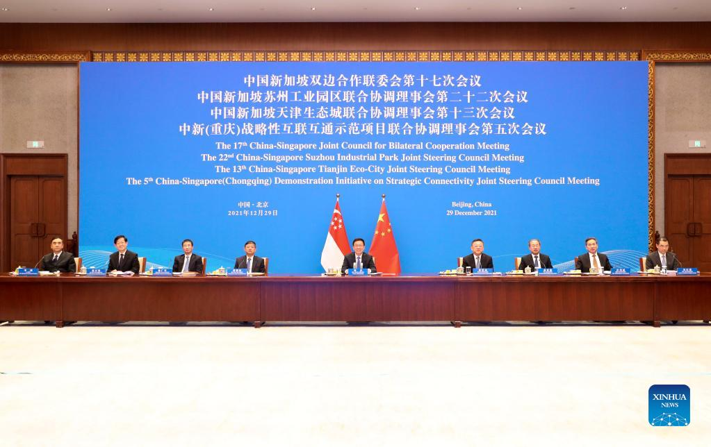 Chinese Vice Premier Han Zheng, also a member of the Standing Committee of the Political Bureau of the Communist Party of China Central Committee, meets with Deputy Prime Minister Heng Swee Keat of Singapore via video link in Beijing, capital of China, Dec. 29, 2021. Han Zheng and Heng Swee Keat co-chaired the 17th China-Singapore Joint Council for Bilateral Cooperation Meeting, the 22nd China-Singapore Suzhou Industrial Park Joint Steering Council (JSC) Meeting, the 13th China-Singapore Tianjin Eco-City JSC Meeting and the 5th China-Singapore (Chongqing) Demonstration Initiative on Strategic Connectivity JSC Meeting. (Xinhua/Ding Haitao)