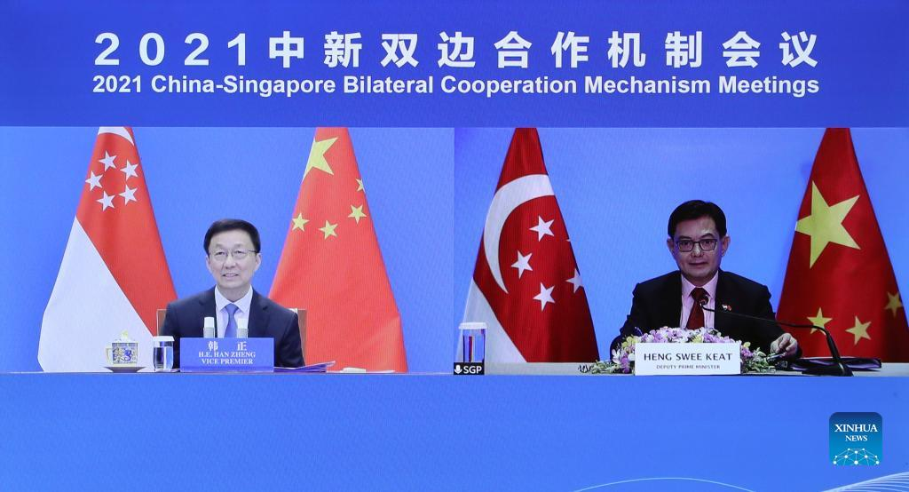 Chinese Vice Premier Han Zheng, also a member of the Standing Committee of the Political Bureau of the Communist Party of China Central Committee, meets with Deputy Prime Minister Heng Swee Keat of Singapore via video link in Beijing, capital of China, Dec. 29, 2021. Han Zheng and Heng Swee Keat co-chaired the 17th China-Singapore Joint Council for Bilateral Cooperation Meeting, the 22nd China-Singapore Suzhou Industrial Park Joint Steering Council (JSC) Meeting, the 13th China-Singapore Tianjin Eco-City JSC Meeting and the 5th China-Singapore (Chongqing) Demonstration Initiative on Strategic Connectivity JSC Meeting. (Xinhua/Ding Haitao)