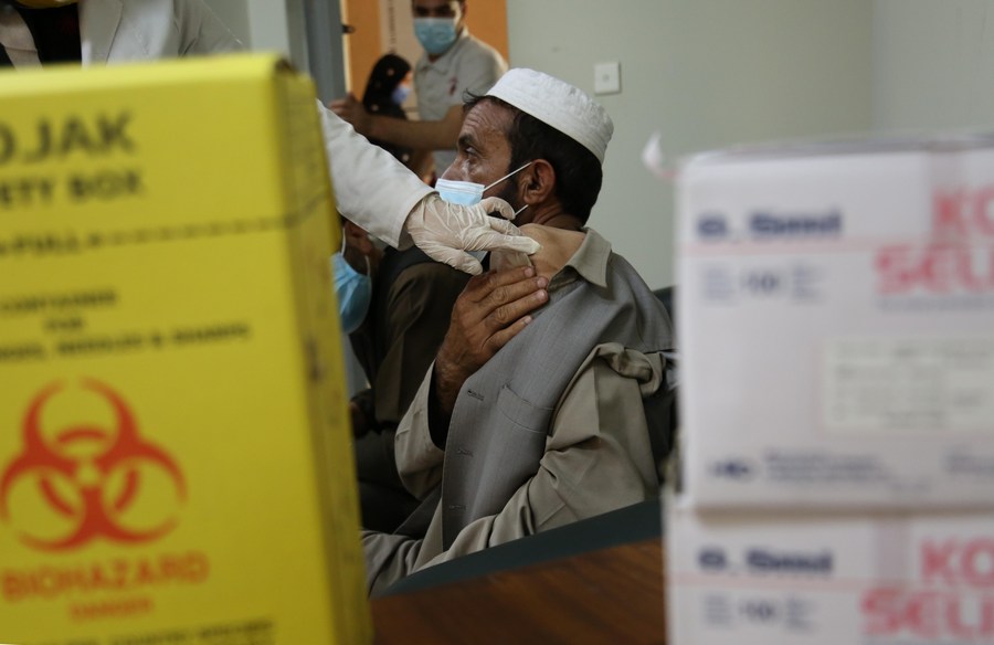 A medical worker administers a dose of China's Sinopharm COVID-19 vaccine in Kabul, capital of Afghanistan, June 17, 2021. (Xinhua/Rahmatullah Alizadah)
