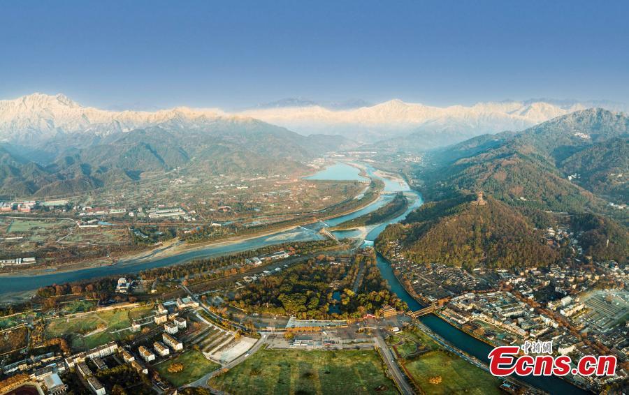 Photo taken on Dec 29, 2021 shows Dujiangyan irrigation system at the foot of a snow-capped mountain, the west part of Chengdu Plain, southwest China's Sichuan province. (China News Service/Chen Xianlin)