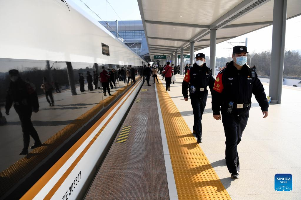 Police officers patrol at the Anqing West Railway Station in Anqing City, east China's Anhui Province, Dec. 30, 2021. A new high-speed railway section linking Anqing City in east China's Anhui Province, with Jiujiang City in east China's Jiangxi Province began operation Thursday. The 176-km line, with seven stations along its route, will reduce travel time between Anhui's capital Hefei and Jiangxi's capital Nanchang to two hours and 22 minutes, according to China Railway Shanghai Group Co., Ltd. The Anqing-Jiujiang high-speed railway has a designed speed of 350 km per hour and is connected to China's vertical artery of the Beijing-Hong Kong Railway. (Xinhua/Liu Junxi)
