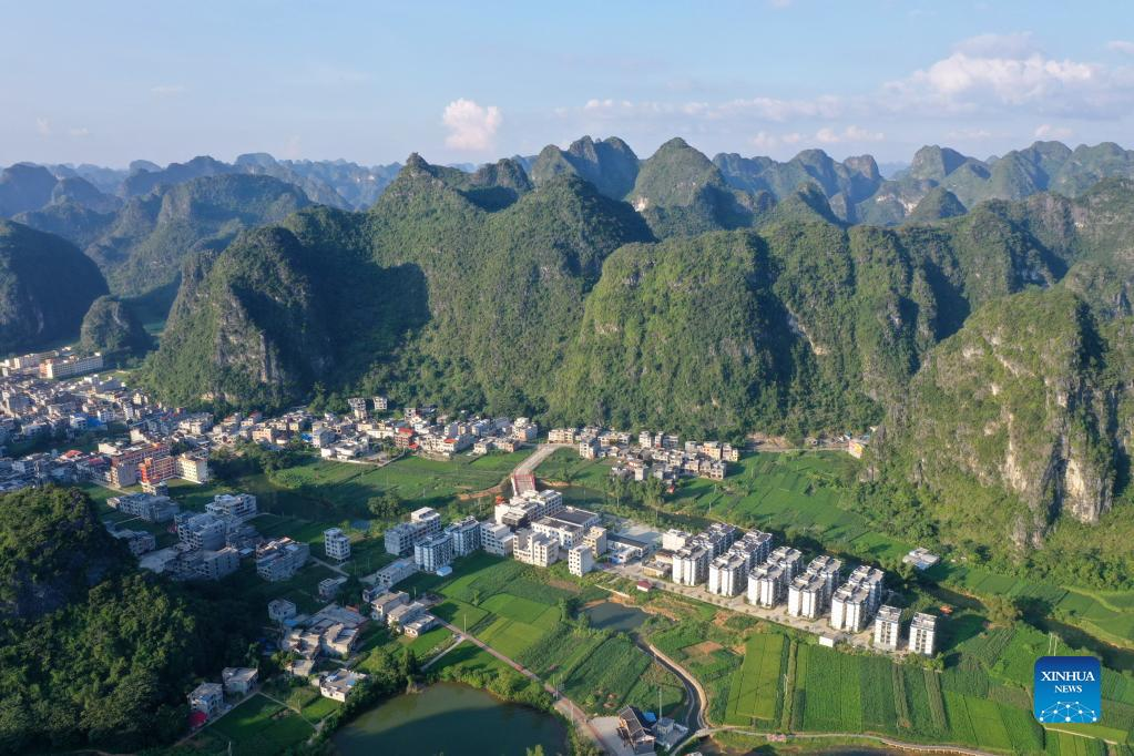 Aerial photo taken on Sept. 2, 2021 shows a view of Dongmiao Township in Du'an Yao Autonomous County, south China's Guangxi Zhuang Autonomous Region. In 2021, Guangxi Zhuang Autonomous Region has made great efforts to accelerate improvement of rural living environment amid the bid to promote rural vitalization and upgrade the living conditions of rural residents. (Xinhua/Lu Boan)
