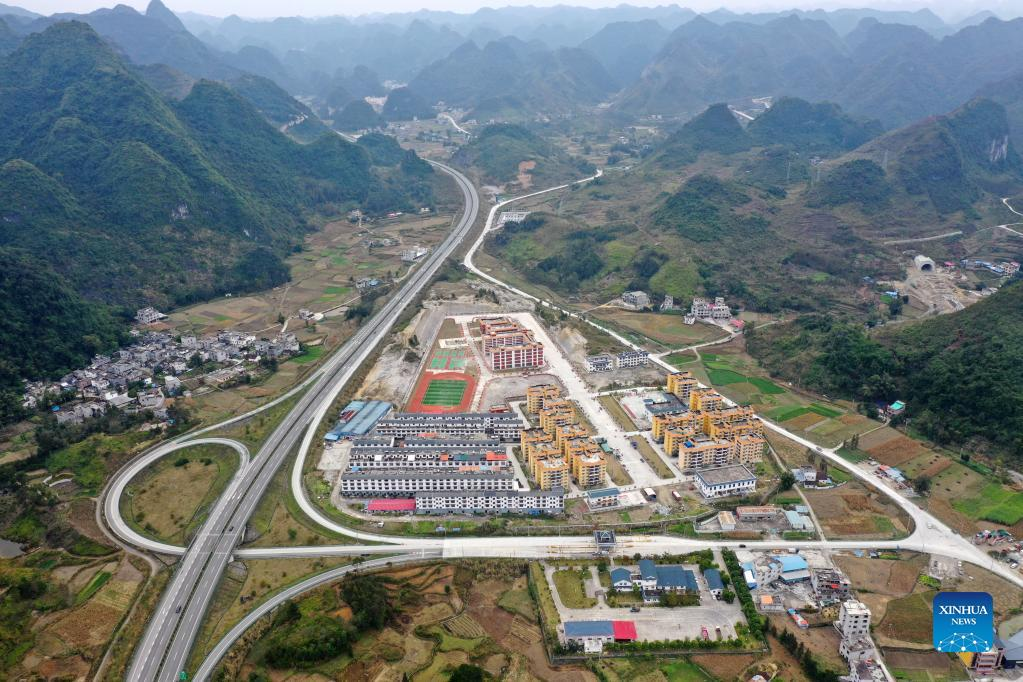 Aerial photo taken on Dec. 29, 2021 shows a relocation area in Yong'an Township of Du'an Yao Autonomous County, south China's Guangxi Zhuang Autonomous Region. In 2021, Guangxi Zhuang Autonomous Region has made great efforts to accelerate improvement of rural living environment amid the bid to promote rural vitalization and upgrade the living conditions of rural residents. (Xinhua/Lu Boan)