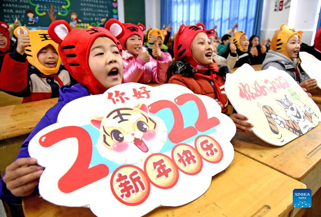Pupils celebrate the upcoming New Year in Lianyungang, east China's Jiangsu Province, Dec. 30, 2021. Schools and kindergartens across China organize various kinds of activities as the New Year approaches. (Photo by Geng Yuhe/Xinhua)
