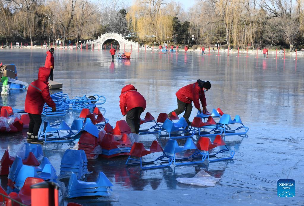 Staff members prepare sleds on a frozen lake at Yuanmingyuan Park in Beijing, capital of China, Dec. 30, 2021. The Old Summer Palace, or Yuanmingyuan, announced on Thursday that it will hold a ice and snow festival which opens around New Year's day in 2022 and lasts until February to welcome the Beijing 2022 Winter Olympic Games. (Xinhua/Luo Xiaoguang)