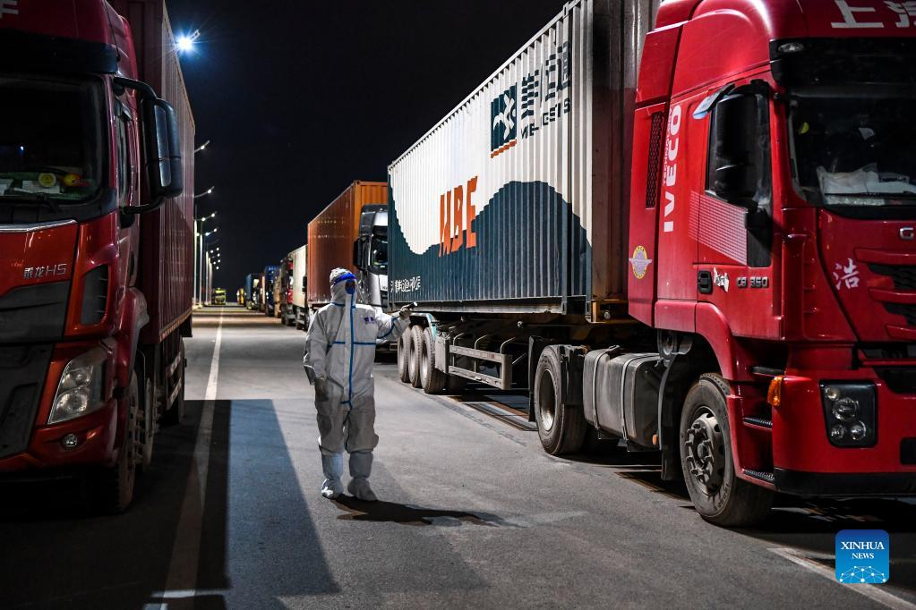 A police officer of immigration inspection checkpoint check trucks at Dongxing port in Dongxing, southwest China's Guangxi Zhuang Autonomous Region, Dec. 30, 2021. Recently immigration inspection checkpoint in Dongxing has upgraded epidemic control and prevention measures by carrying out round-the-clock patrol. (Xinhua/Cao Yiming)