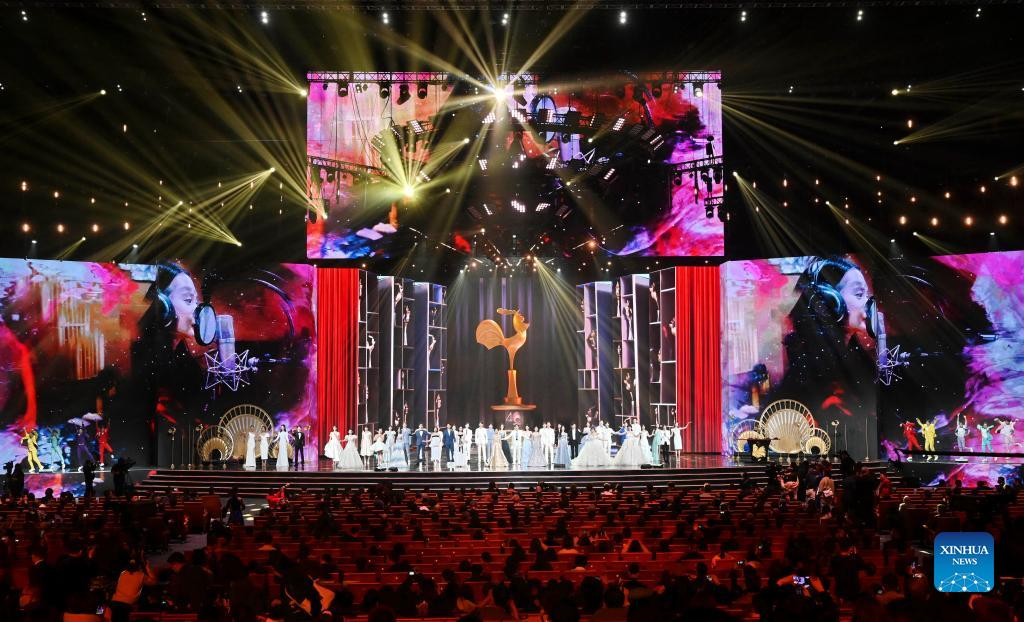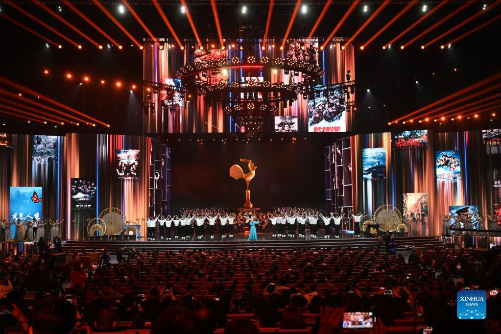 Photo taken on Dec. 30, 2021 shows the awarding ceremony of the 34th China Film Golden Rooster Awards in Xiamen, southeast China's Fujian Province. The awarding ceremony of the 34th China Film Golden Rooster Awards was held in Xiamen on Thursday. (Xinhua/Lin Shanchuan)