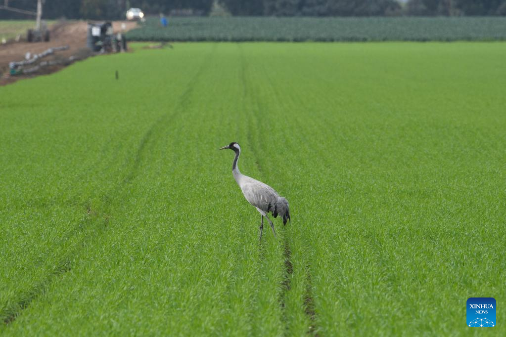 A crane is seen in the Hula Valley in northern Israel, on Dec. 30, 2021. The Hula Nature Reserve and Hula Lake park have been closed to the public to prevent the spread of pathogenic H5N1 avian influenza, according to local media. (Ayal Margolin/JINI via Xinhua)