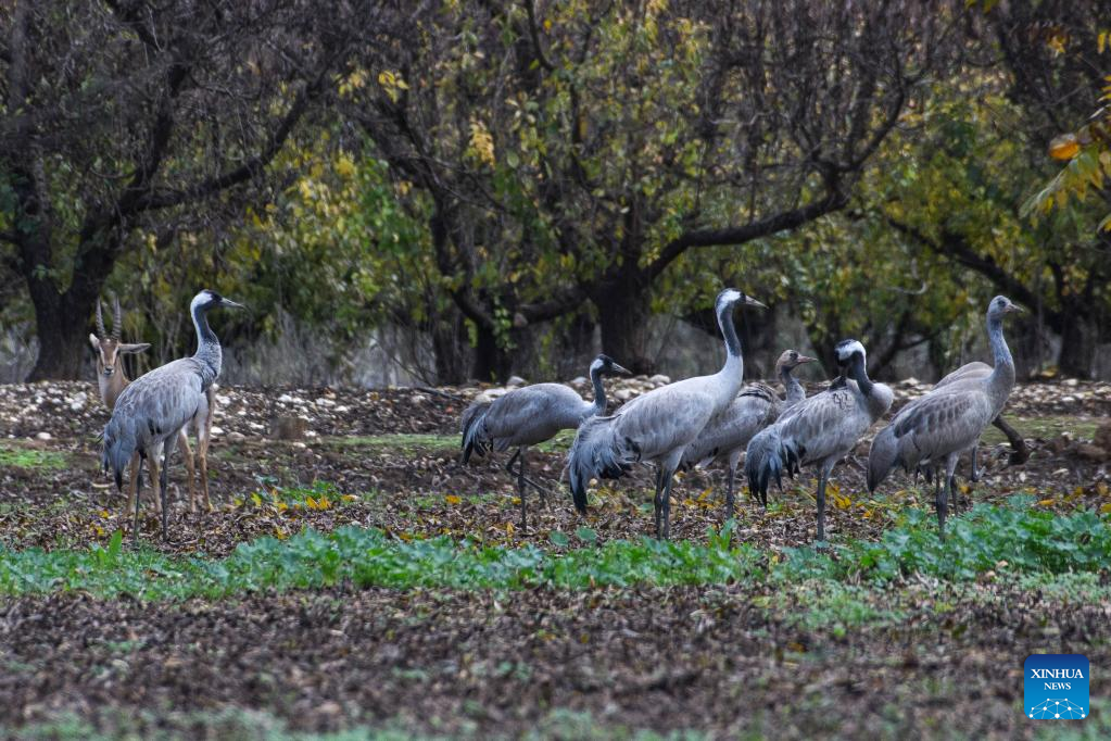 A flock of cranes are seen in the Hula Valley in northern Israel, on Dec. 30, 2021. The Hula Nature Reserve and Hula Lake park have been closed to the public to prevent the spread of pathogenic H5N1 avian influenza, according to local media. (Ayal Margolin/JINI via Xinhua)