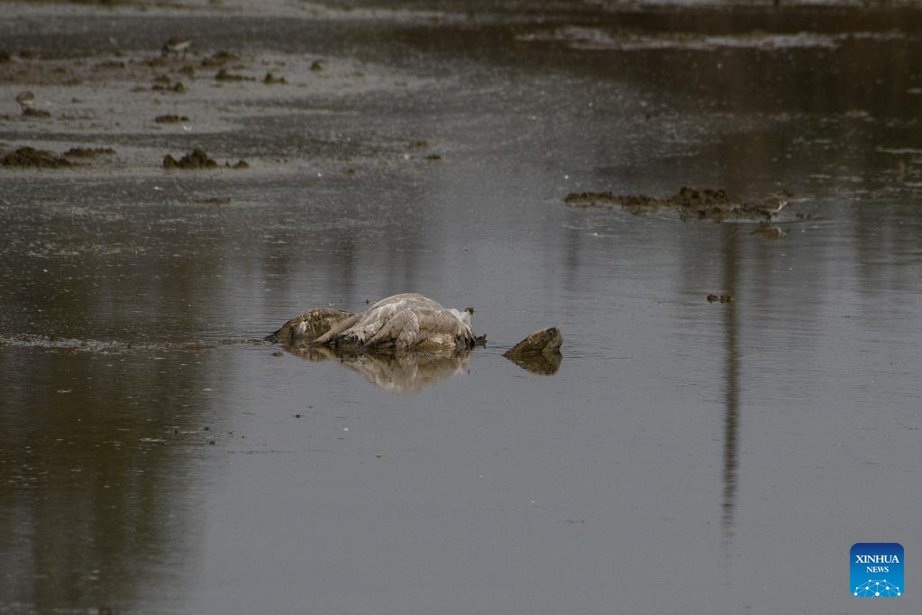 A dead crane is seen in the Hula Valley in northern Israel, on Dec. 30, 2021. The Hula Nature Reserve and Hula Lake park have been closed to the public to prevent the spread of pathogenic H5N1 avian influenza, according to local media. (Ayal Margolin/JINI via Xinhua)